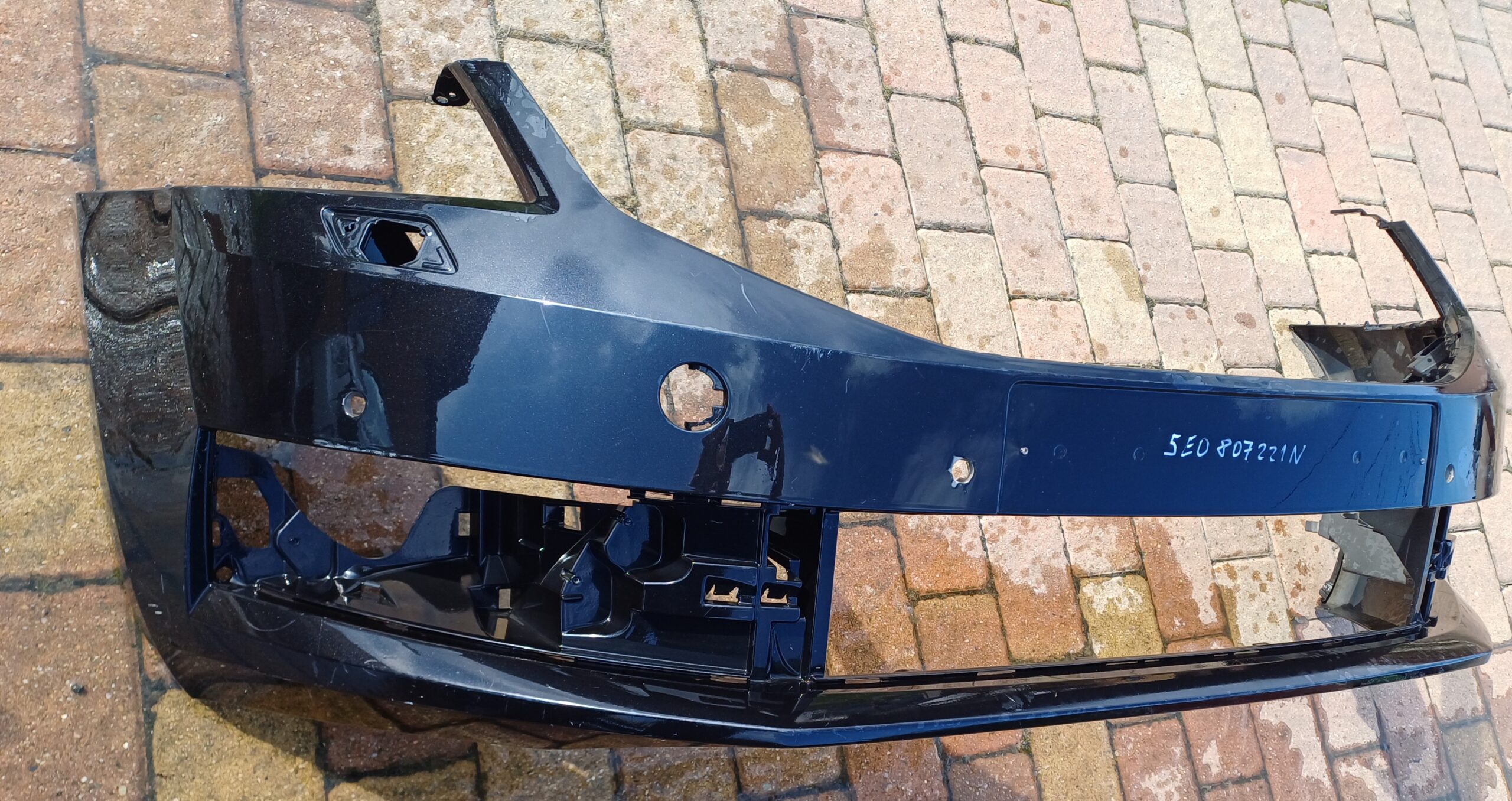 Nárazník facelift, číslo dílu 5E0807221N, s otvory na parkovací senzory a odstřikovače světel. Drobné poškození viz foto.