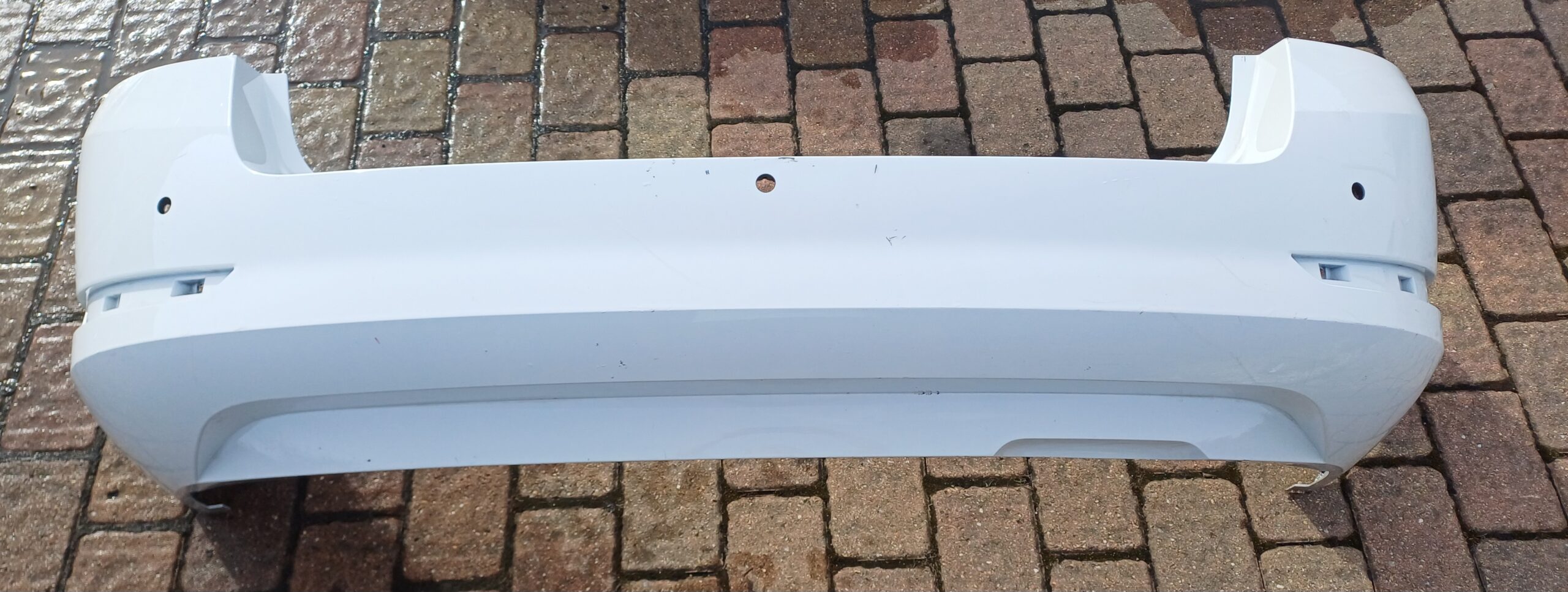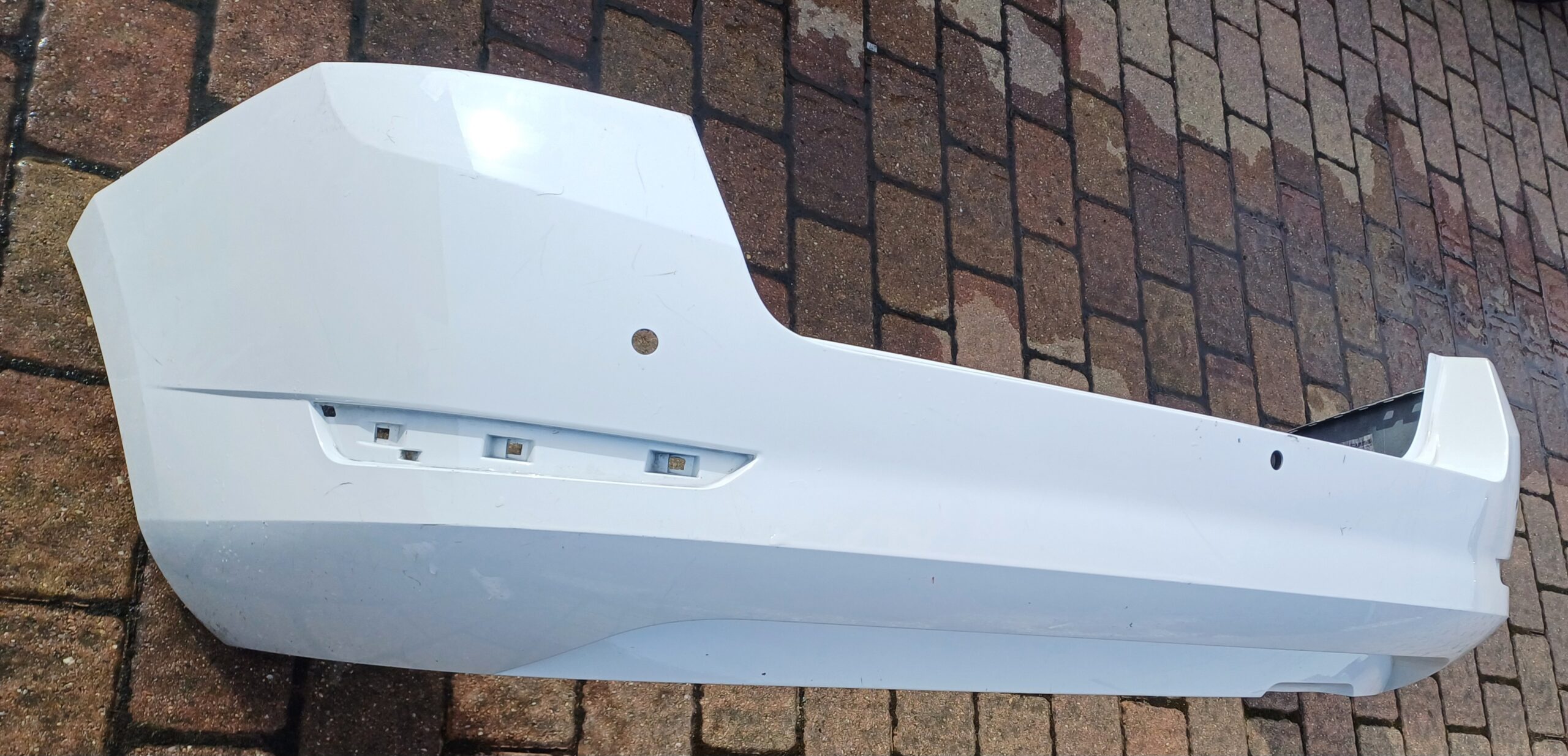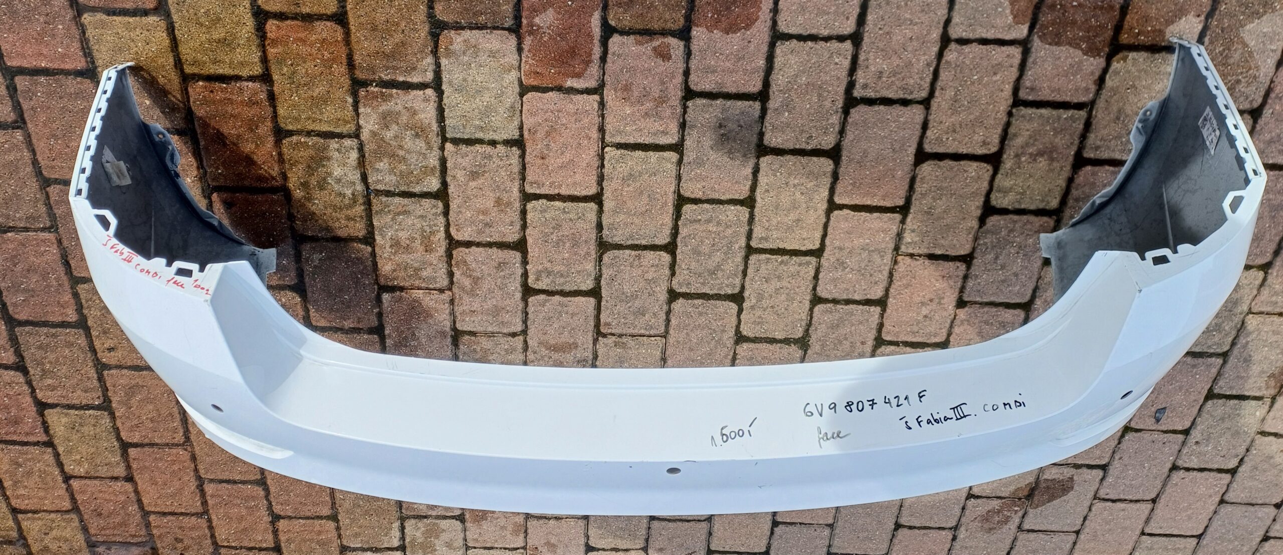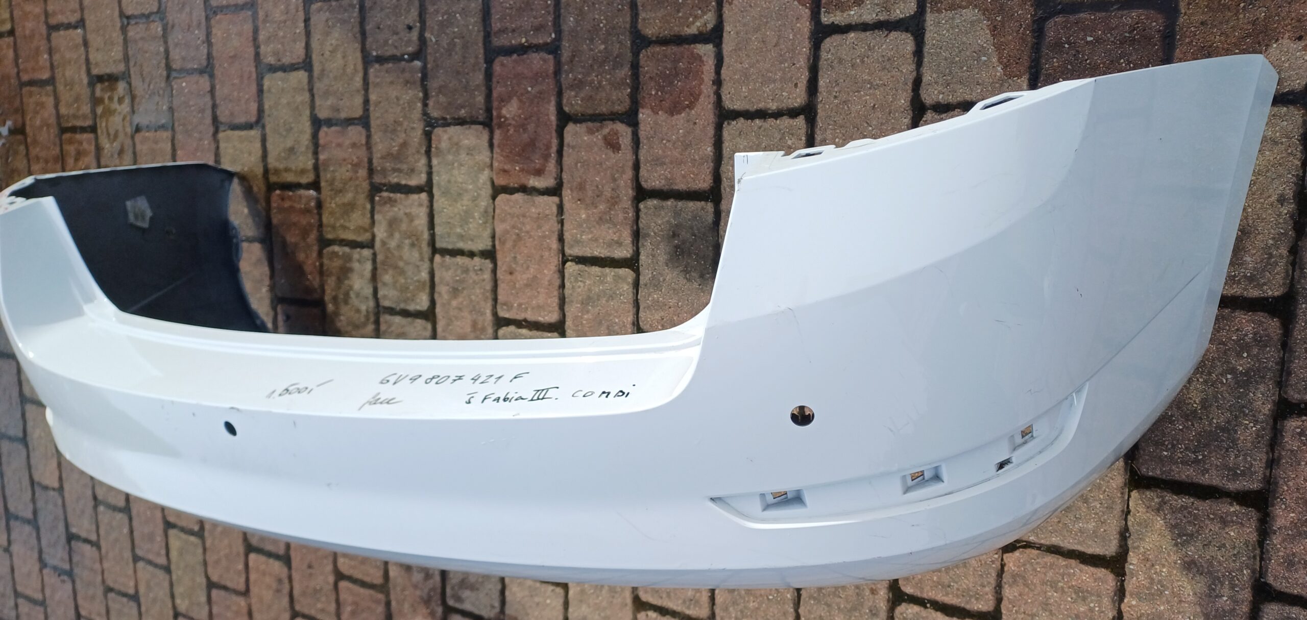 Zadní nárazník Škoda Fabia III combi, facelift. Číslo dílu 6v9807421F. Poškození viz foto. Použitý díl. Otvory na parkovací senzory.