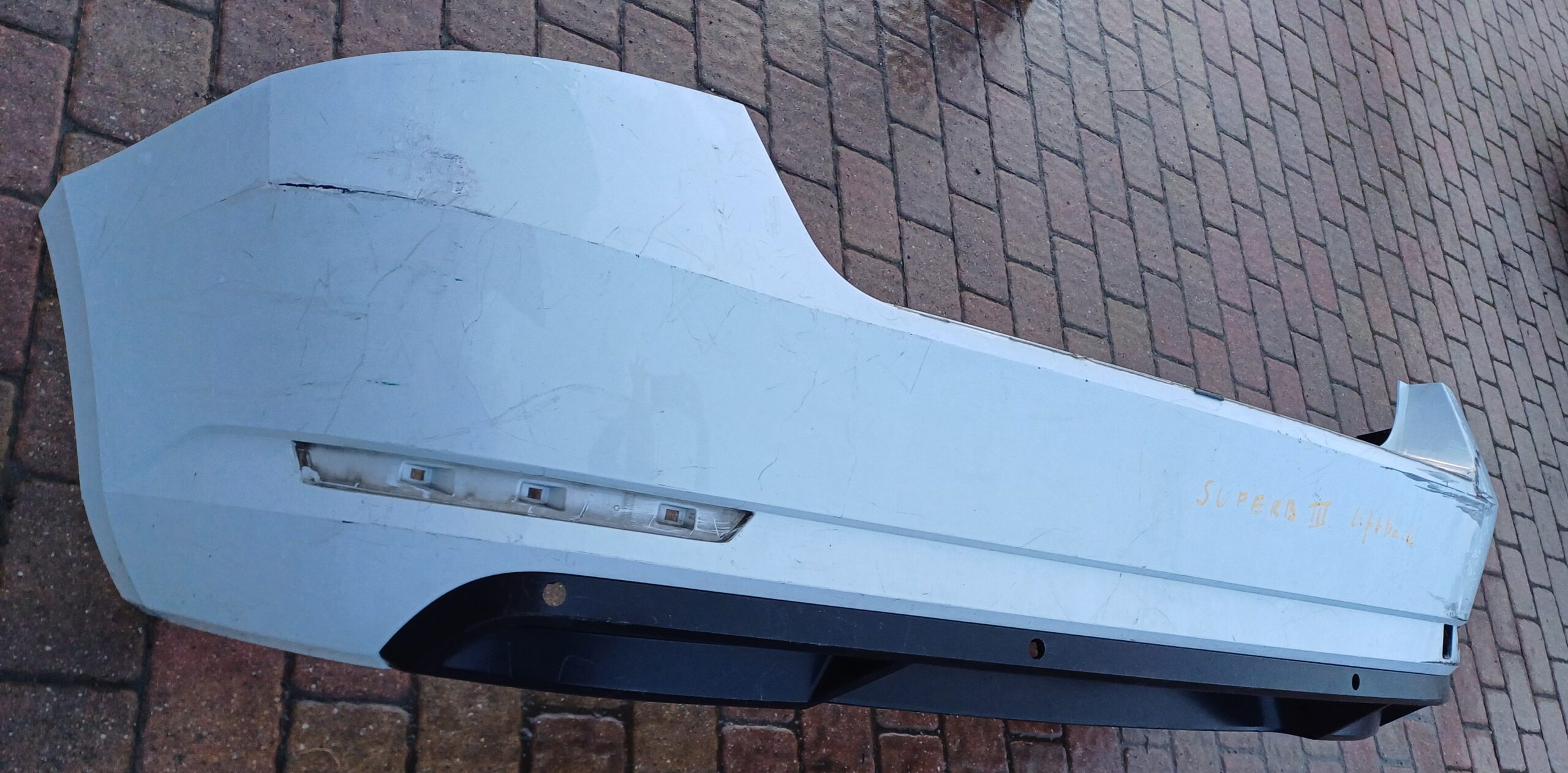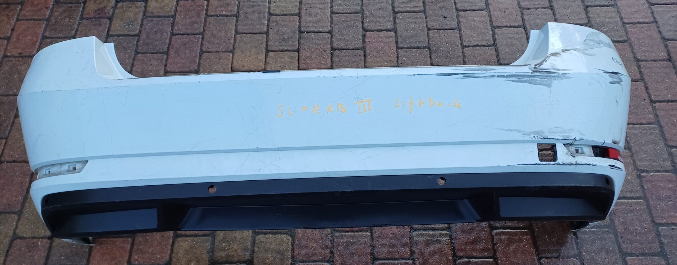 Zadní nárazník Škoda SUPERB III liftback/sedan. Číslo dílu 3V5807421, poškození viz foto cena. Spojler je součástí. Použitý díl.